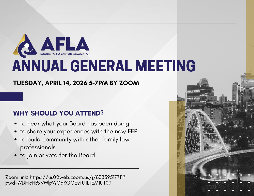 Please join AFLA for the 2026 AGM on April 14, 2026 from 5-7pm. The flyer is attached and zoom link is as follows: https://us02web.zoom.us/j/83859517711?pwd=WDF1cHBx...